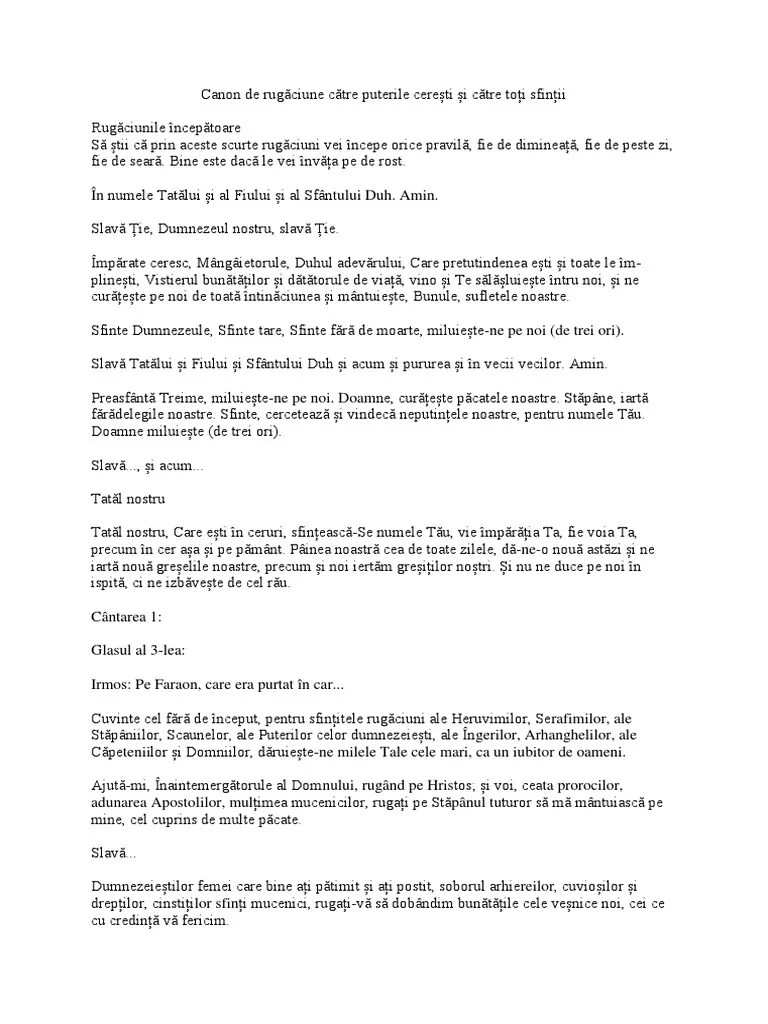 Canon de rugăciune către puterile cerești și către toți sfinții. 17.05.2012 · canon de rugaciune catre puterile ceresti si catre toti sfintii.. Împărate ceresc, mângâietorule, duhul adevărului, care pretutindenea ești și toate le împlinești, vistierul bunătăților și dătătorule de viață, vino și te sălășluiește întru noi, și ne.